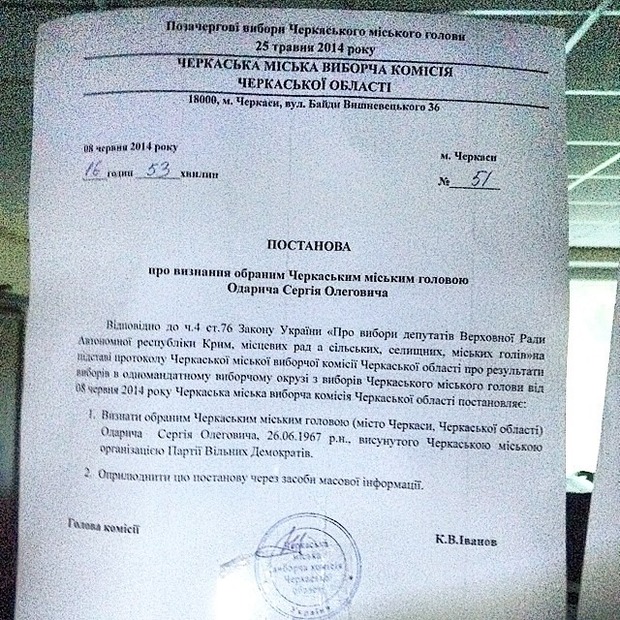 Щойно Черкаська міська територіальна виборча комісія визнала обраним міським головою Черкас Сергія Одарича.