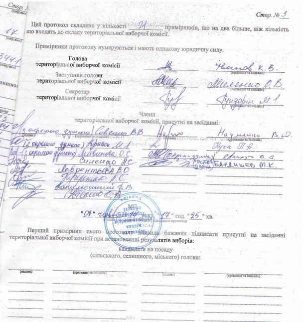 – Тоді протокол підписав голова, секретар і почали підписувати члени комісії. Голова підписав постанову одразу, бо він підписує її один. А протокол "гуляв по руках" ще довго, і час поставлено було, коли усі підписали. Непідписання протоколу членом комісії не тягне його недійсності. Головне-–було проголосовано саме в правильному порядку, – зазначив Микола Кудрявцев.
