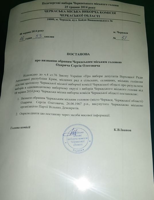Нагадаємо, що у неділю Черкаська ТВК оголосила міським головою Черкас Сергія Одарича. За нього проголосували понад 50 ти. черкасців.