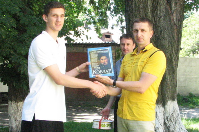 Директор клубу Володимир Гриценко презентував імениннику колекційний "Кобзар" та солодкий подарунок.