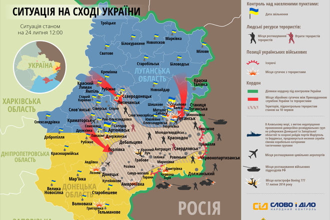 За даними РНБО, станом на 12:00 продовжується наступ українських військ на півночі Луганської та на заході Донецької областей. Зараз ідуть наступальні бої за визволення Лисичанська. Терористи заблоковані в місті, їм відрізані шляхи до відступу. Продовжується оточення та блокування Донецька і Луганська.
