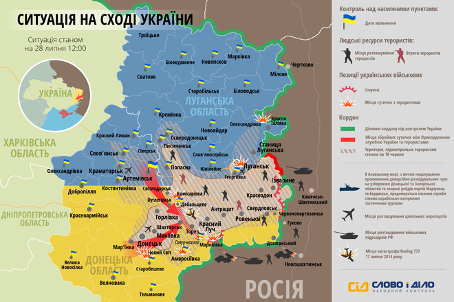 За даними РНБО, українські військові взяли під контроль Саур-Могилу. Крім того, триває зачистка від терористів Дебальцевого, взято в оточення Горлівку. Карту збільшеного розміру можна побачити ТУТ.