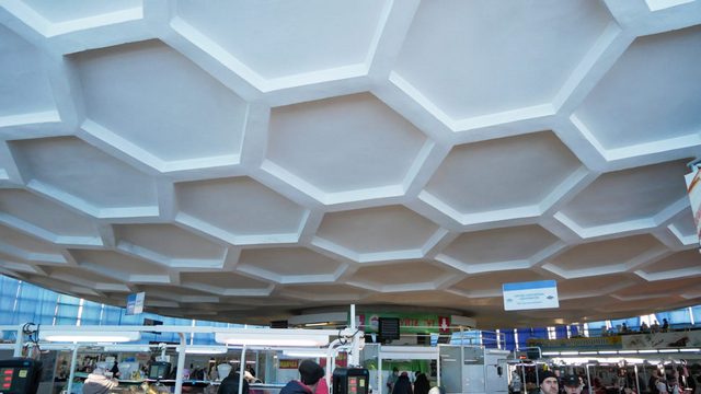 Якщо зовні будівля здається просто круглою, то всередині вона справляє зовсім інше враження. Найвідоміша деталь — стеля, яку часто порівнюють із бджолиними сотами. Це один із найсміливіших інженерних експериментів свого часу.