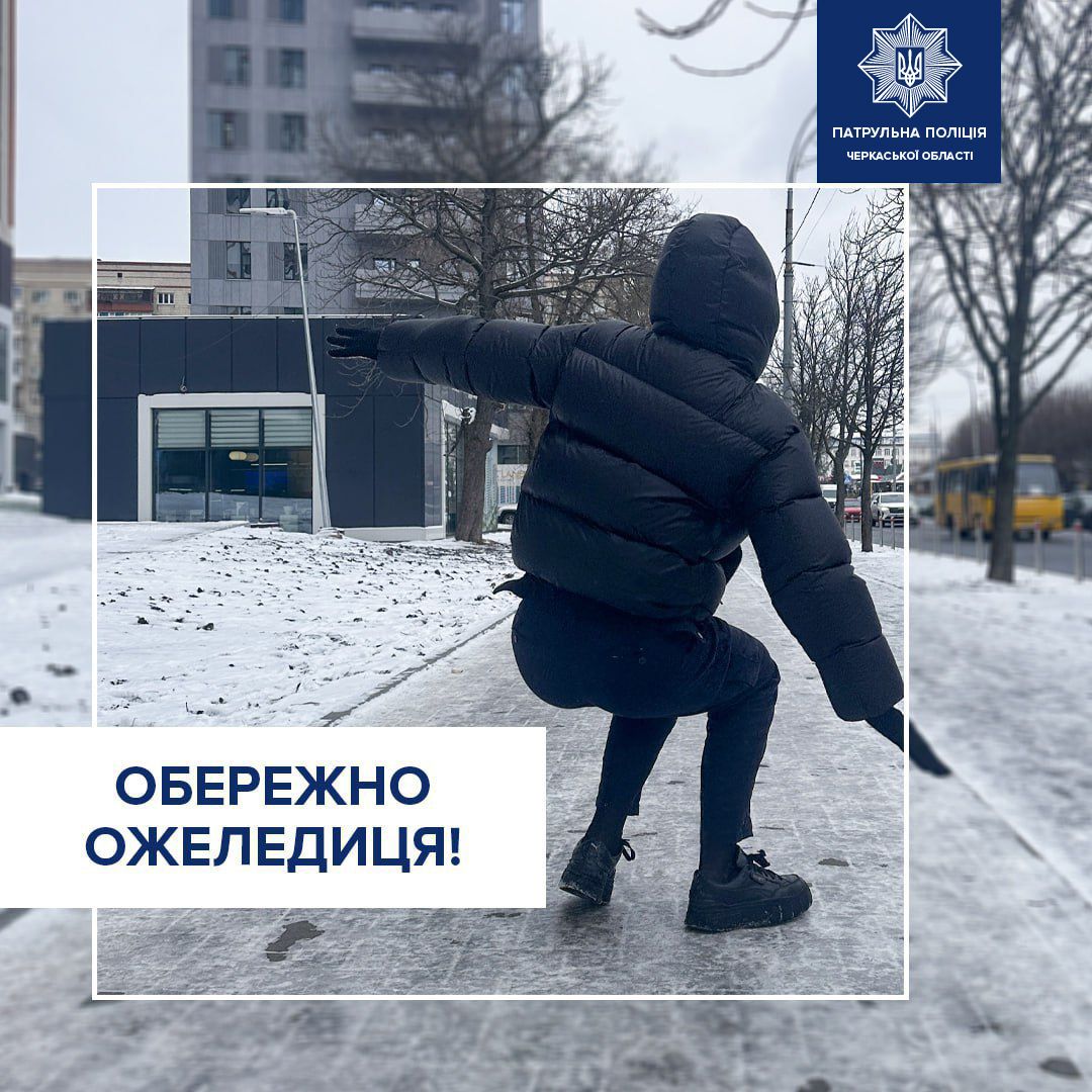На дорогах Черкащини — ожеледиця. Патрульна поліція області попереджає: слизьке дорожнє покриття суттєво підвищує ризик падінь і травм, особливо для пішоходів. За таких погодних умов навіть звичний шлях до роботи чи магазину може стати небезпечним.