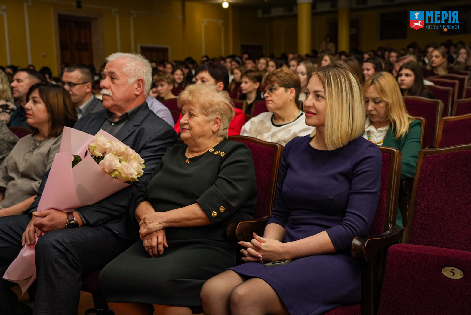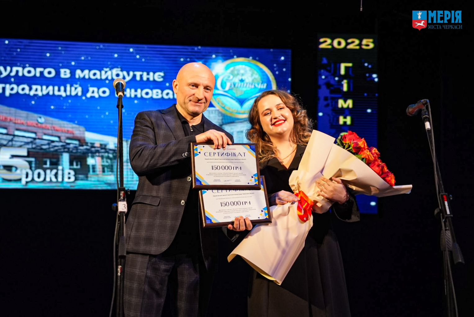 Заступниця міського голови та кураторка освітньої галузі Анастасія Чубіна вручила колективу Грамоту виконкому. Вона підкреслила, що освіта — стратегічна сфера, а Перша міська гімназія є її гідним представником у Черкасах.