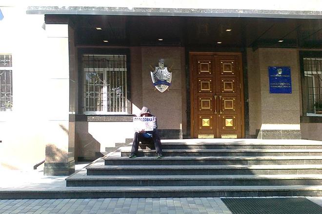 Біля приміщення прокуратури Черкаської області сидить чоловік із табличкою "Голодую". Чоловік обурений, що прокуратура мляво реагує на злочини, тож так вирішив продемонструвати свій протест.