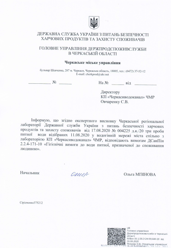 Згідно з експертним висновком, відхилень від норм не виявлено. Питна вода, яку споживають черкащани, відповідає вимогам ДСанПін 2.2.4-171-10 “Гігієнічні вимоги до води питної, призначеної для споживання людиною”. Про це інформує пресслужба КП “Черкасиводоканал“.