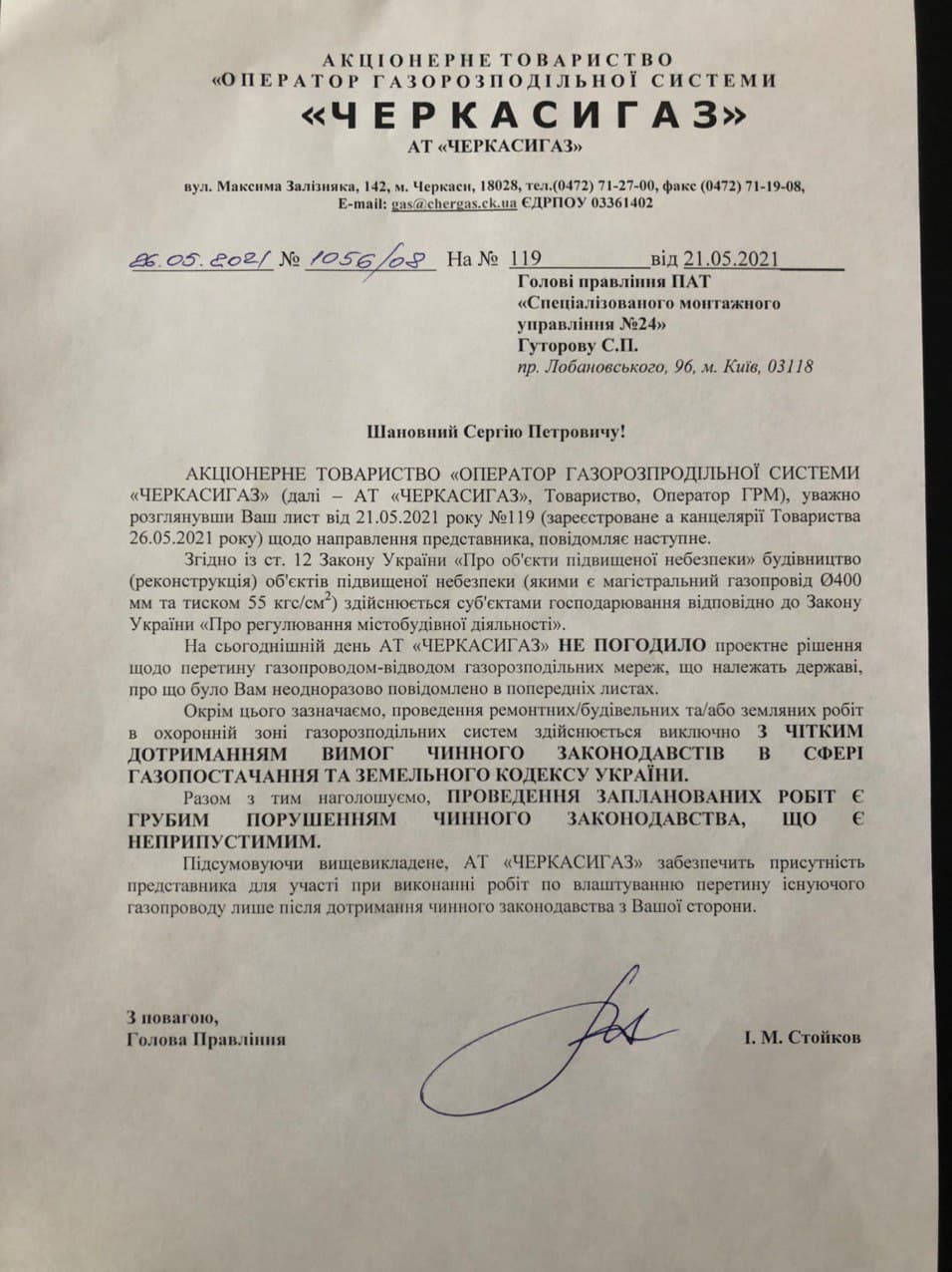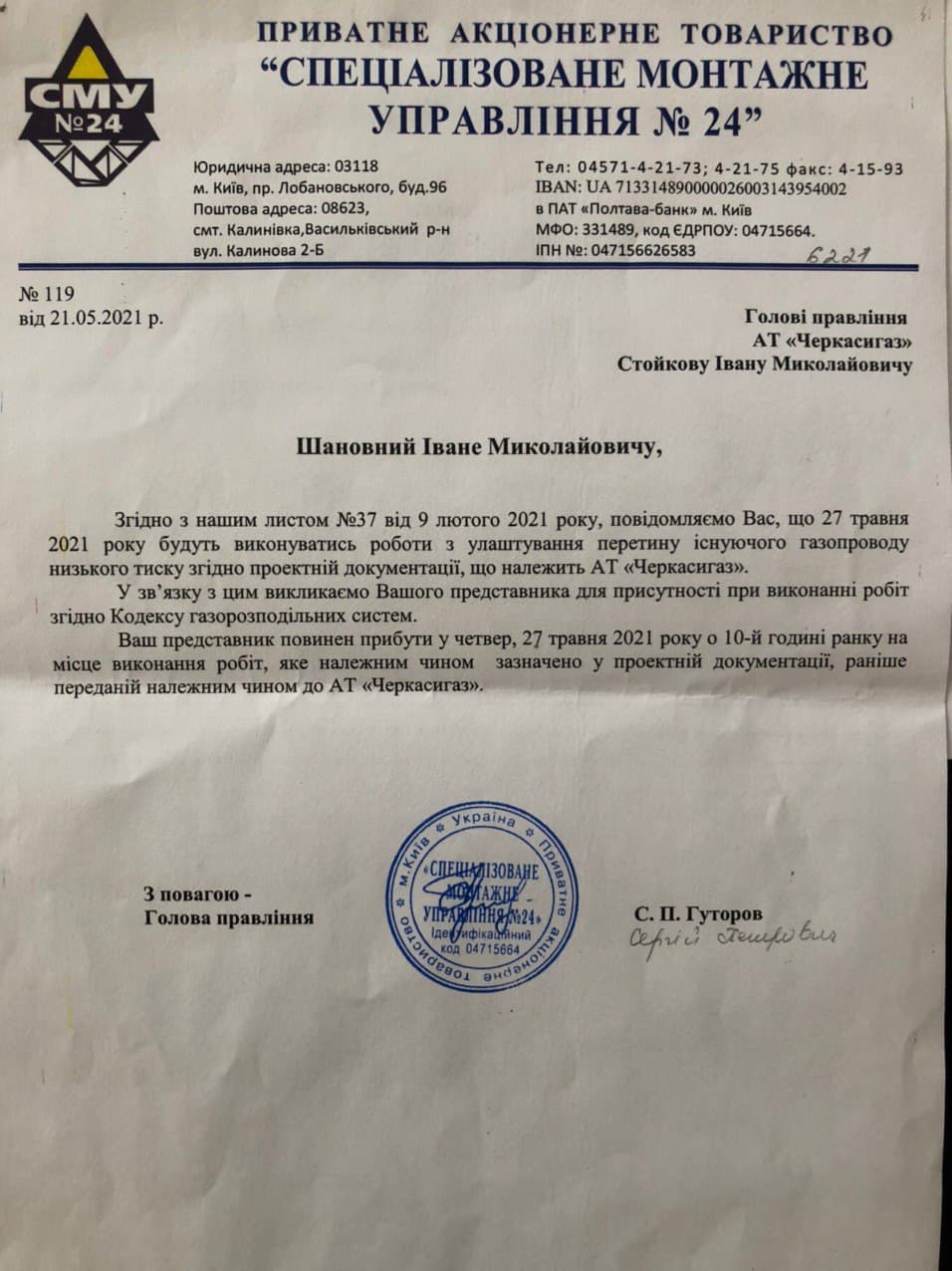 Днями керівництво АТ «Черкасигаз» отримало листа від київської компанії «Спеціалізоване монтажне управління №24», в якому йдеться про намір з 27 травня виконати роботи з улаштування перетину існуючого газопроводу низького тиску згідно з проектною документацією, яка належить «Черкасигаз». Проте на підприємстві стверджують, що жодних дозволів для цих робіт нікому не видавали.