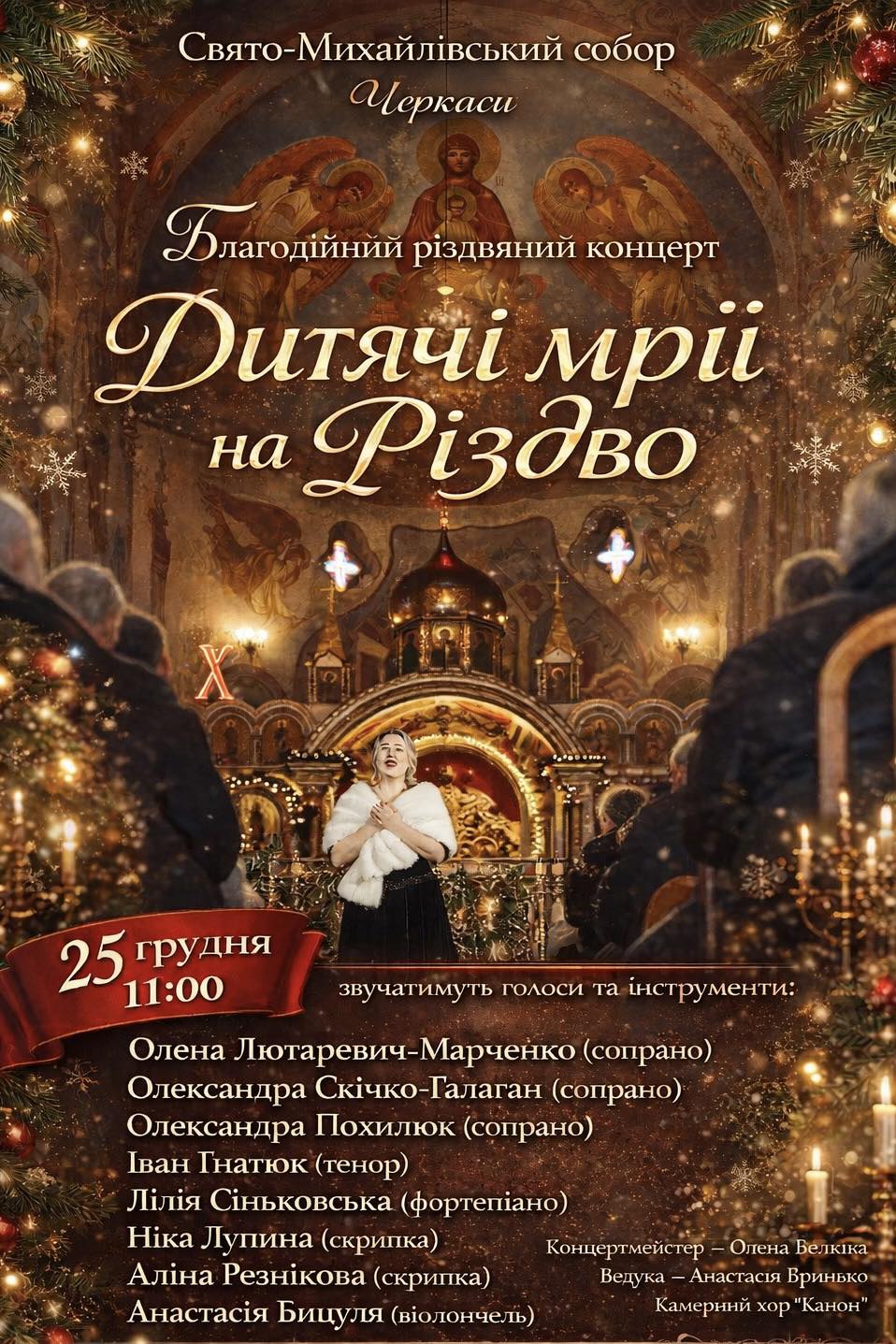 Свято-Михайлівський кафедральний гарнізонний собор у Черкасах готується до Різдва Христового. Напередодні свята тут проведуть різдвяний концерт. Благодійний мистецький захід об’єднає духовну музику, колядки та спільну молитву.