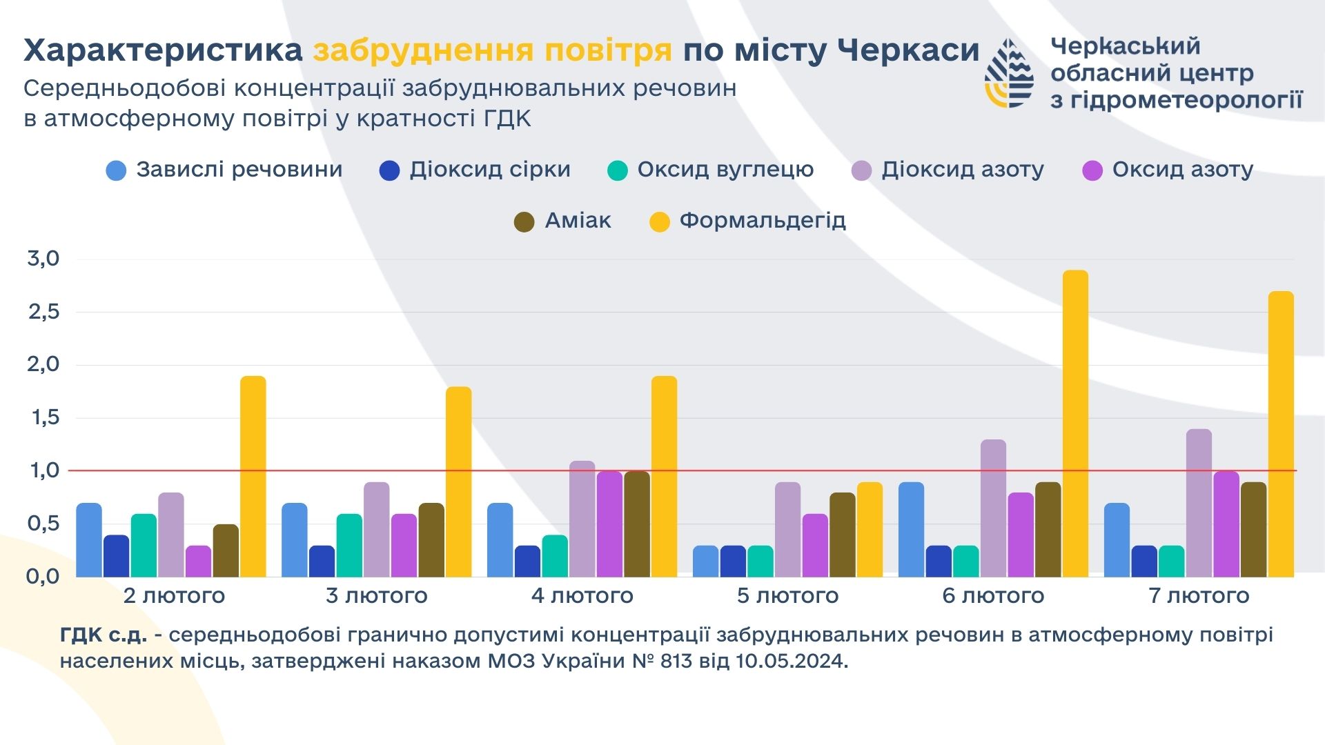 Найпомітніші проблеми фіксували за діоксидом азоту, аміаком і формальдегідом. Діоксид азоту у місті коливався від 0,75 до 1,5 від допустимого рівня. Найбільш забрудненими назвали центр Черкас та Південно-Західний мікрорайон. Аміак тримався від 0,5 до 1,0, і знову найбільше навантаження припало на центр. Формальдегід показав найвищий результат: 2,0 від норми у Дніпровському мікрорайоні.