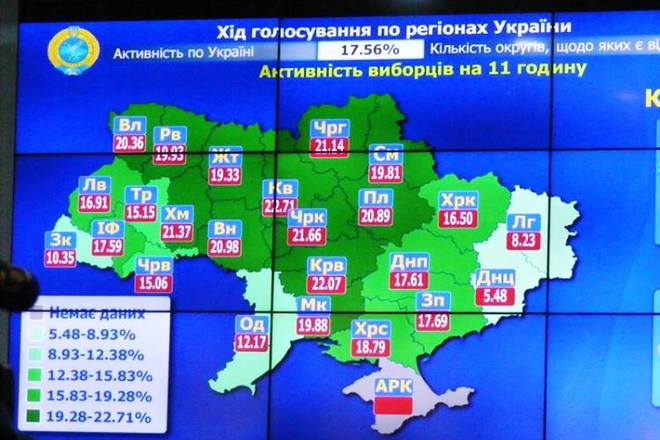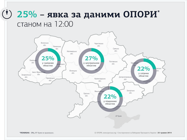 Натомість ГМ ОПОРА, яка веде паралельний підрахунок, інформує, що станом на 12:00 у Центральниій Україні проголосувало вже 27 %. На Заході – 25 %.Найменше – 22 % – голосують у південних і східних областях.