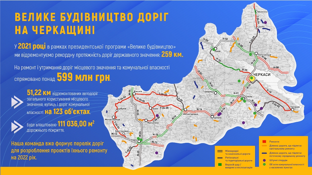 Цього року на Черкащині планують відремонтувати рекордну протяжність доріг державного значення: 259 км.