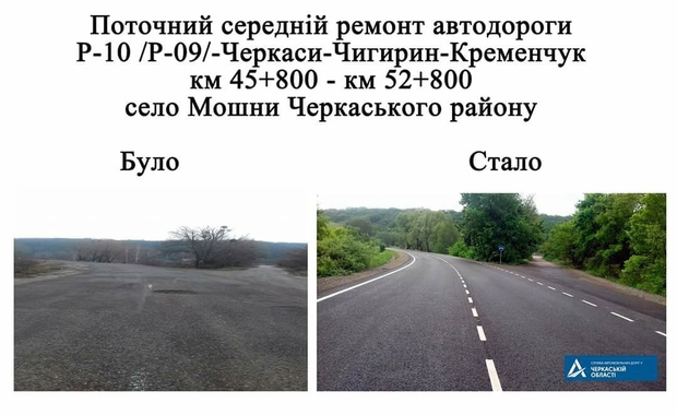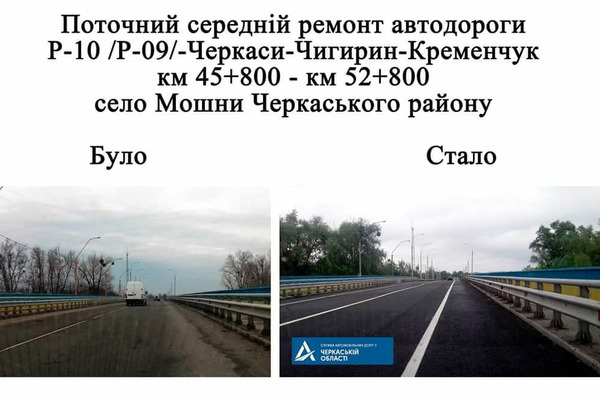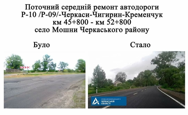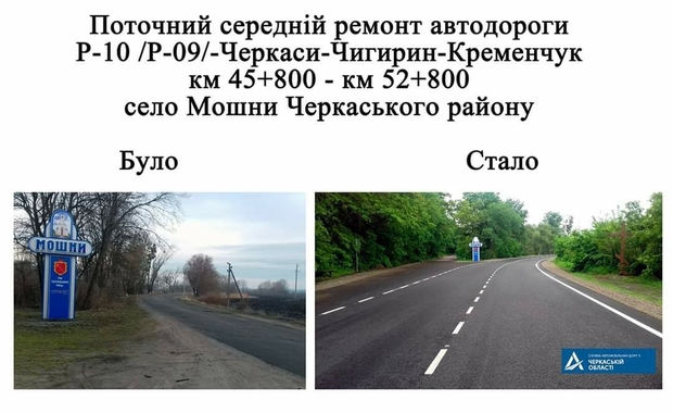 Крім того, що ТОВ "Головшляхбуд" вже завершує ремонт ще однієї ділянки цієї ж дороги в с. Софіївка, яку теж обіцяє здати в експлуатацію достроково в липні поточного року, на минулому тижні це підприємство виграло тендер на ремонт ще однієї ділянки дороги Р10 в с. Будище. При експертній вартості 134 млн. грн., компанія здійснить ремонт за 118 млн. грн., тобто держава заощадить на цьому будівництві 16 млн.грн. Якщо врахувати, що ділянку між Софіївкою та Мошнами в цьому ж році відремонтує компанія ТОВ "Росдорстрой", то до кінця 2020 року дорога Канів – Черкаси – Кременчук на всьому протязі від Канева до Черкас буде відновлена, що відкриє транспортний коридор від Черкас до Києва по правому березі Дніпра, який одночасно є дуже важливим туристичним маршрутом країни, і як показує практика с. Мошни,може послужити каталізатором зростання економічної активності регіону.