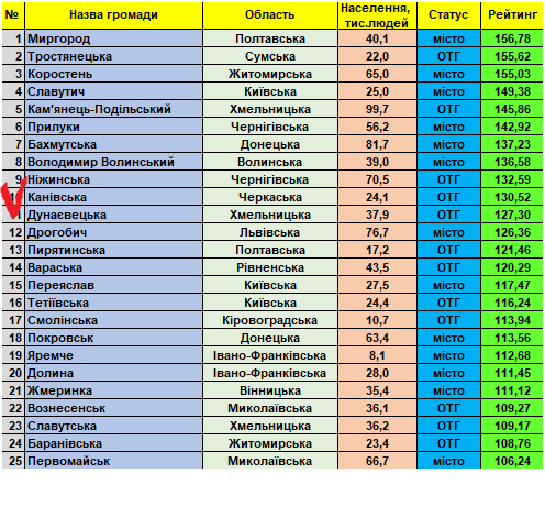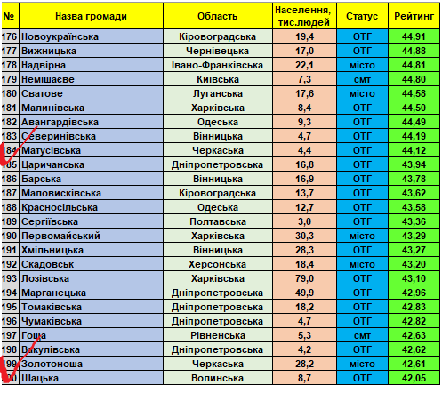В ТОП-200 найкращих громад України увійшли три об’єднані територіальні громади Черкащини – Канівська (10-те місце), Карашинська (155-те) і Матусівська (184 -те) та місто Золотоноша (199-е).