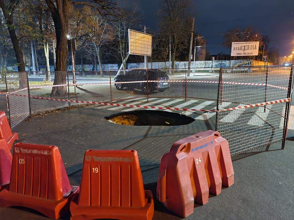 Як повідомили у КП «Черкасиводоканал», трапилась аварія на каналізаційному колекторі Ду800 мм. Внаслідок газової корозії зруйновано верхню частину колектора, відбувся обвал ґрунту та руйнування асфальтового покриття.