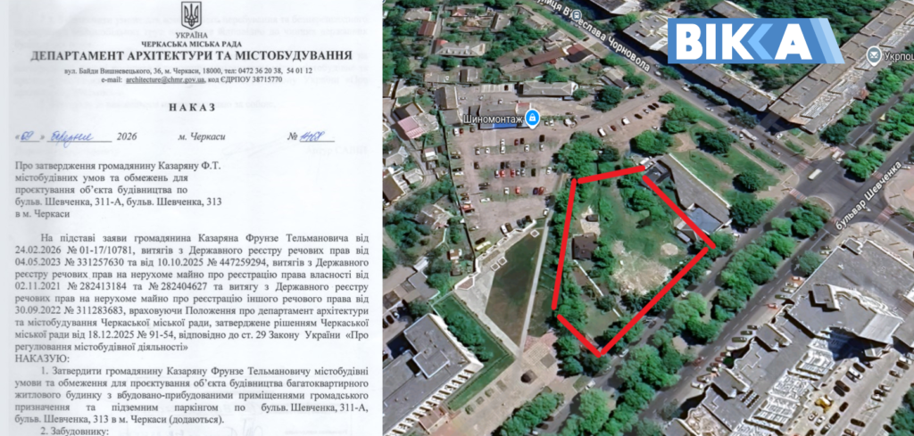 Мерія Черкас дозволила громадянину Фрунзе Казаряну звести багатоповерхівку по бульвару Шевченка неподалік будівлі, де розташований департамент соціальної політики Черкаської міської ради. Відповідні містобудівні умови та погодження надав департамент архітектури ЧМР.