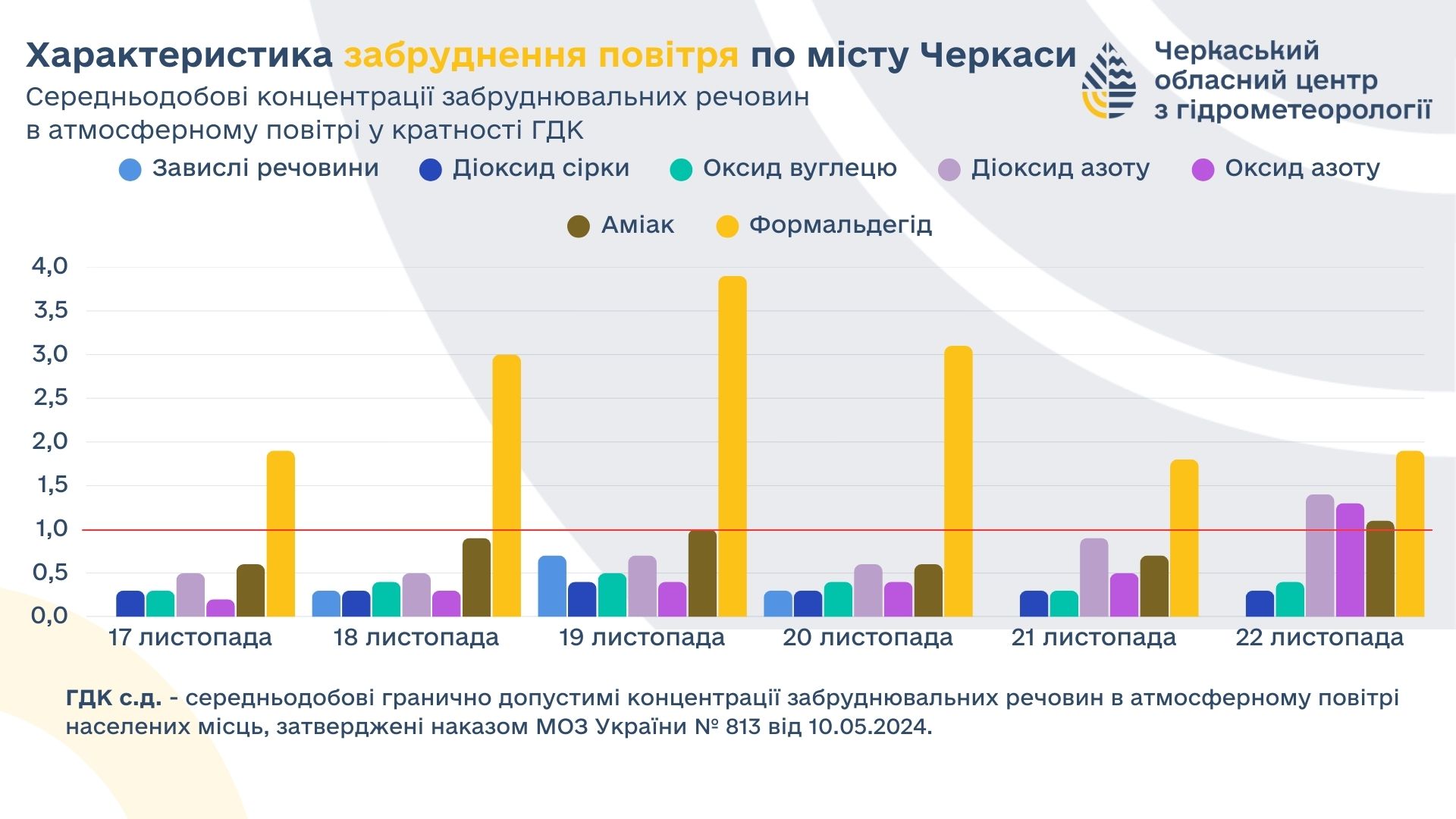 Черкаський обласний центр з гідрометеорології оприлюднив черговий звіт про стан атмосферного повітря в місті за період 17–22 листопада. Лабораторія відібрала 395 проб у різних частинах Черкас — у центрі, Дніпровському та Південно-західному мікрорайонах.