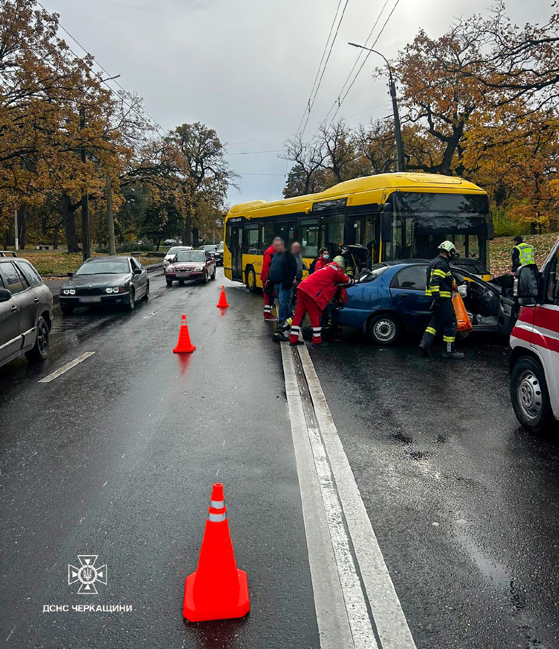 У Черкасах, 28 жовтня на вулиці Дахнівській сталася дорожньо-транспортна пригода за участю легкового автомобіля та маршрутного автобуса. Про це повідомили у телеграм-каналі ДСНС Черкаси.