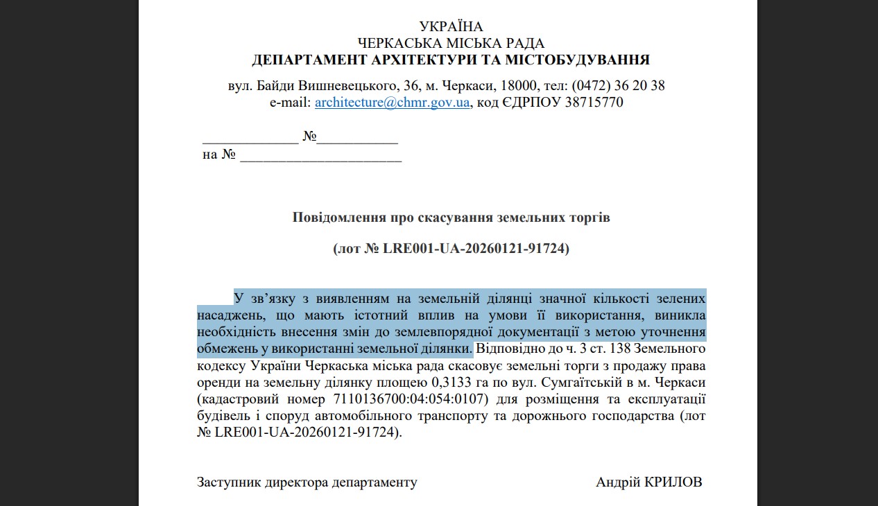 Мерія Черкас скасувала земельні торги з права продажу оренди земельної ділянки по вулиці Сумгаїтській. Причина – виявилося, що на земельній ділянці дуже багато зелених насаджень. Оголошення про відміну аукціону розмістили на порталі «Прозоро».