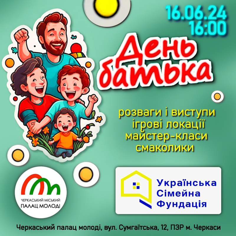 Черкаський міський палац молоді організовує святкування Дня батька 16 червня. Про це повідомляє Черкаський міський палац молоді.
