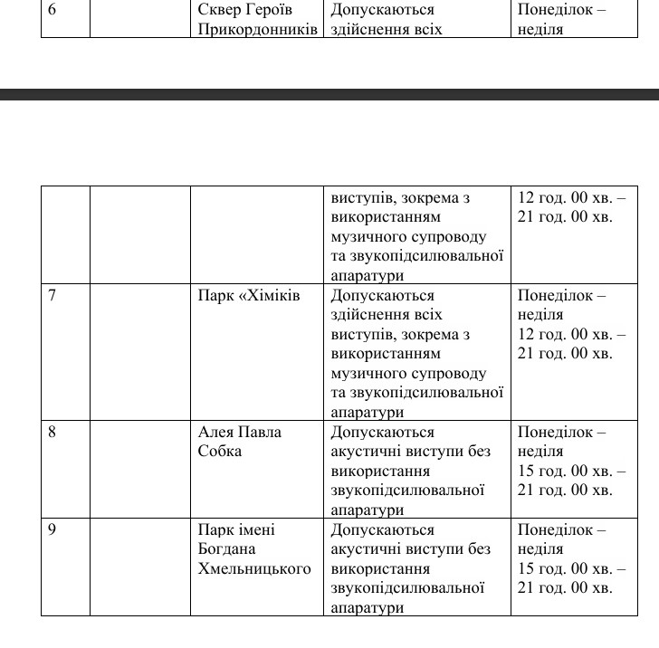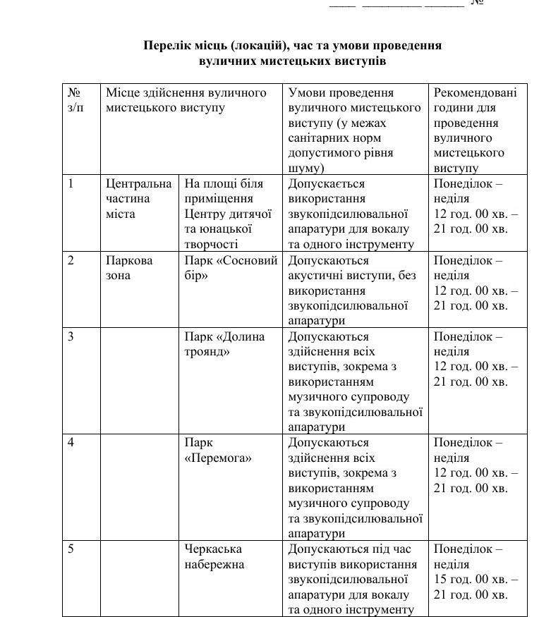 Вуличним музикантам дозволено виступати: з 12:00 до 21:00 або з 15:00 до 21:00 (залежно від локації). Усього визначено 9 місць у центрі міста та паркових зонах.