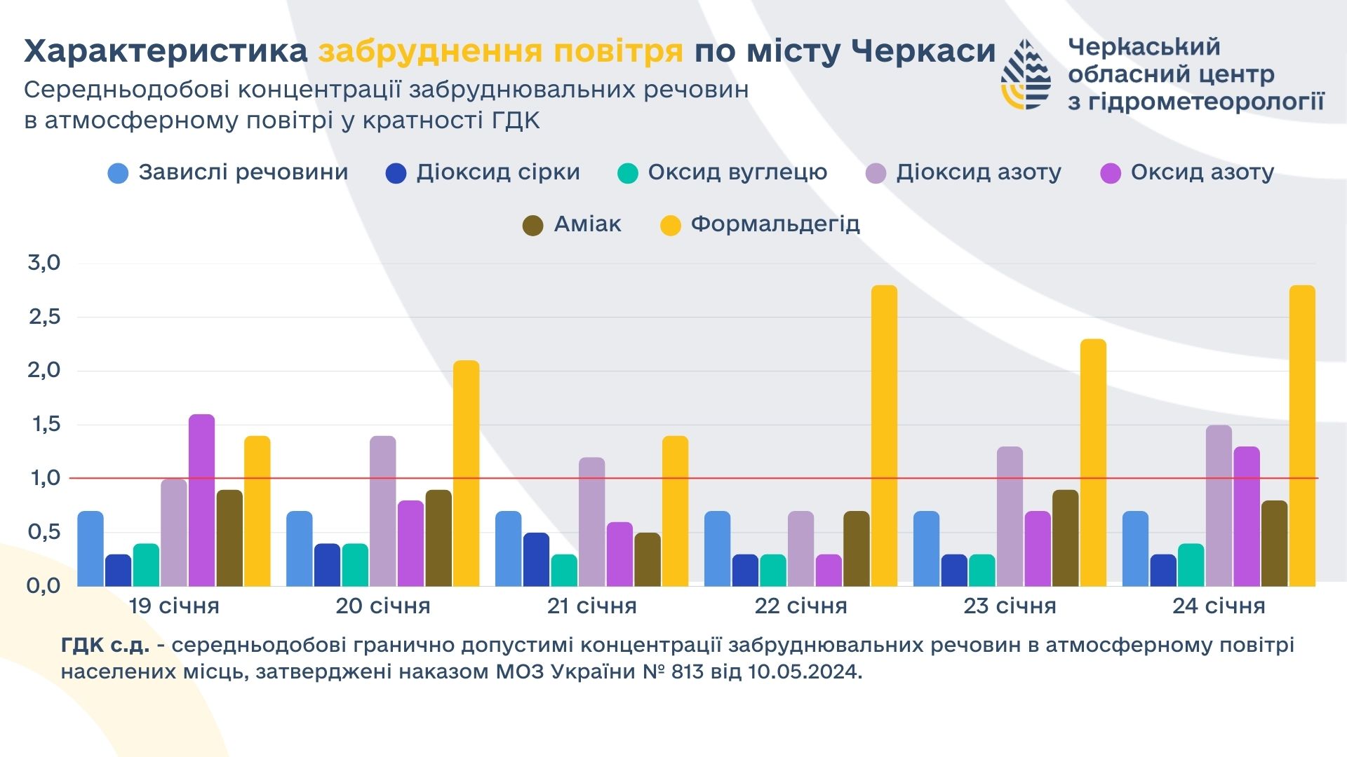- Аміак перевищував норму у 1,1–1,4 раза в центрі міста 20, 23 та 24 січня.