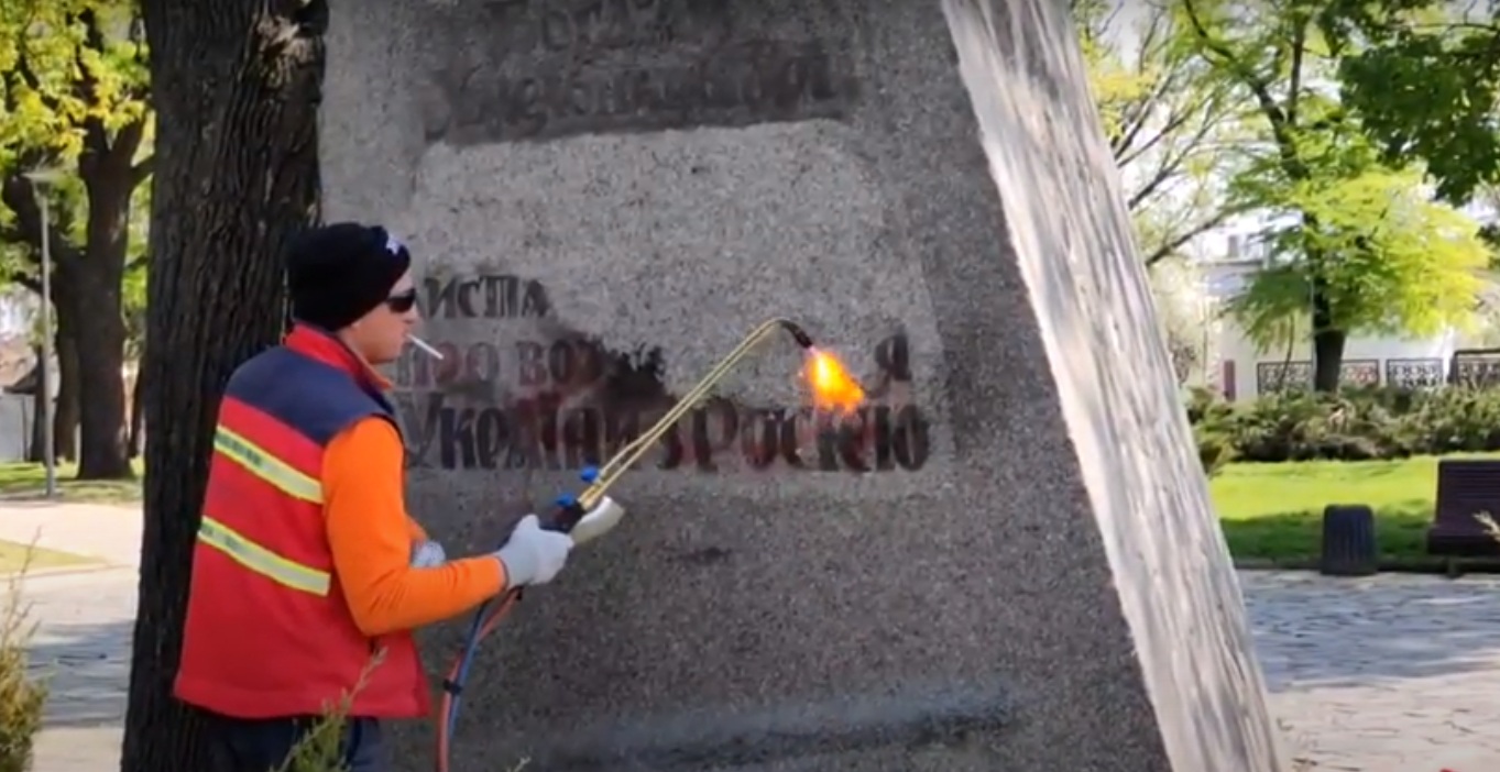 “Але навіть після початку повномасштабної війни ми цього не дочекались. Тому переговорили зі скульптором Дмитром Бур’яном, який зараз проходить службу в ЗСУ, щоб він порадив, як вивести цей напис. Він дав контакти двох скульпторів, які зголосились допомогти. Тож не чекаючи поки зважиться міська влада, активісти разом із представниками тероборони самі його прибрали“, — пояснив він.