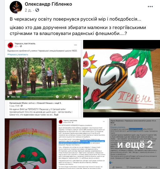 “В черкаську освіту повернувся русскій мір і побєдобєсія. Цікаво, хто дав доручення збирати малюнки з георгіївськими стрічками та влаштовувати радянські флешмоби…?” – написав містянин.