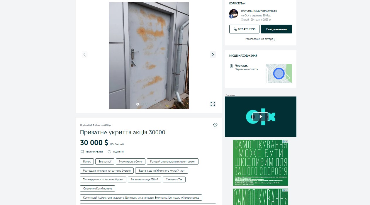 На сайті «ОЛХ» з’явилося оголошення про продаж у Черкасах частини укриття, яке перебуває у приватних руках. Автор оголошення зазначає, що продає підвальне приміщення, щоб мати можливість за виручені кошти добудувати сховище.