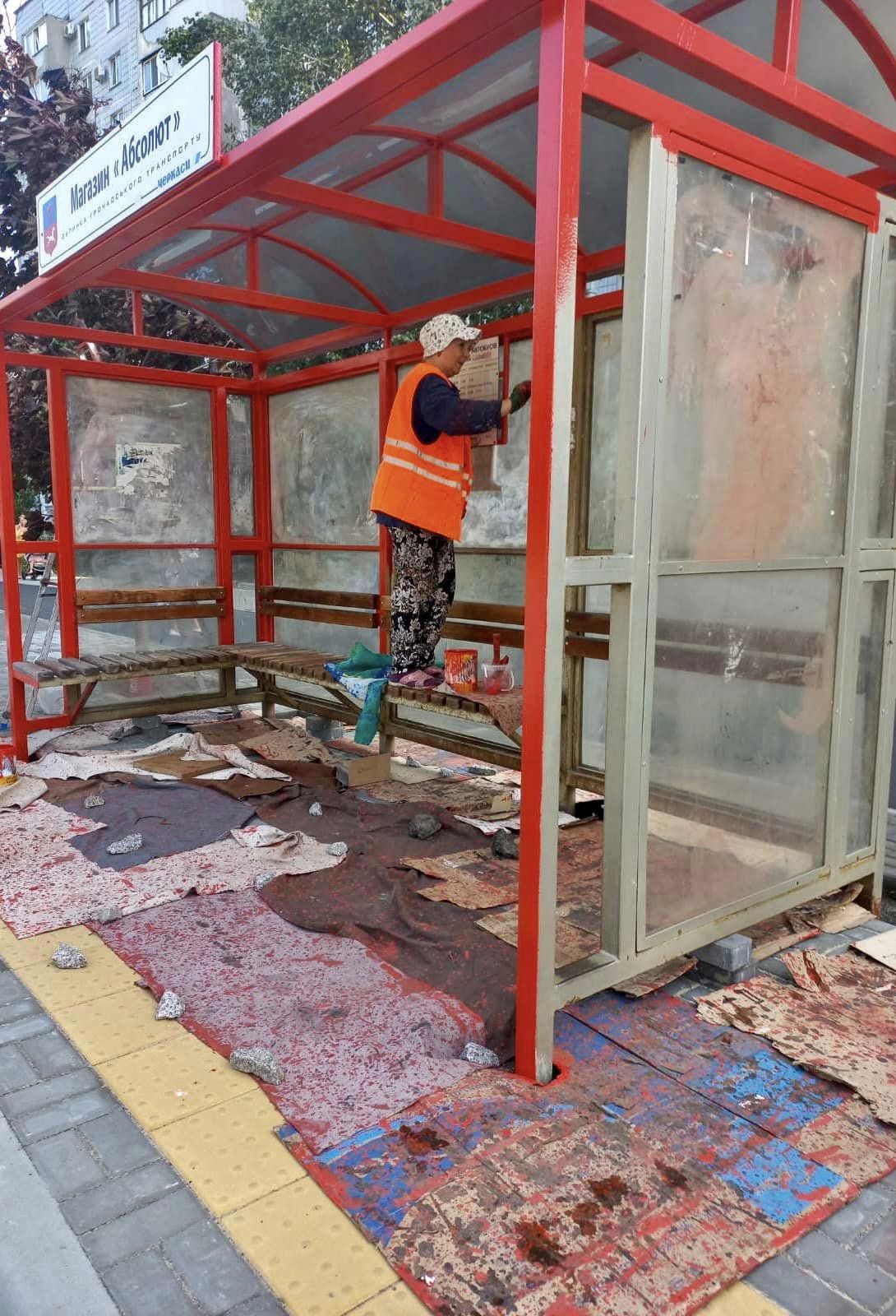 Паралельно з прибиранням, комунальники продовжують роботи з фарбування і ремонту зупинок.