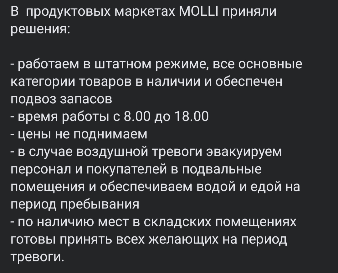 — У випадку повітряної тривоги ми евакуюємо персонал і покупців у підвальні приміщення й забезпечимо водою та їжею на час перебування, — зазначив власник мережі «MOLLI» Радислав Ткаченко.