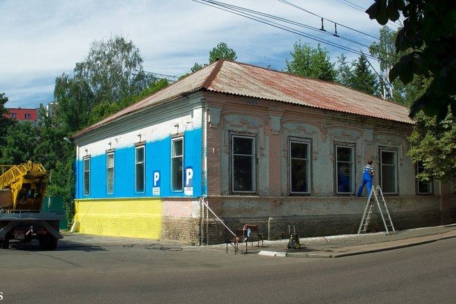 Будинок по бульвару Шевченка перефарбовують у кольори національного прапора України. Фото оприлюднили в соцмережі Вконтакте. Як зазначають користувачі соцмережі, пофарбована будівля розташована неподалік бару "777".