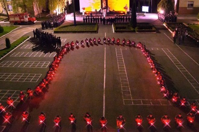Уночі 70 курсантів навчального закладу, саме в той же час, коли пролунав вибух, о 1:00 23 хвилини 50 секунд, вишикувалися у формі чорнобильського дзвону на плацу, передає "Телеграф".