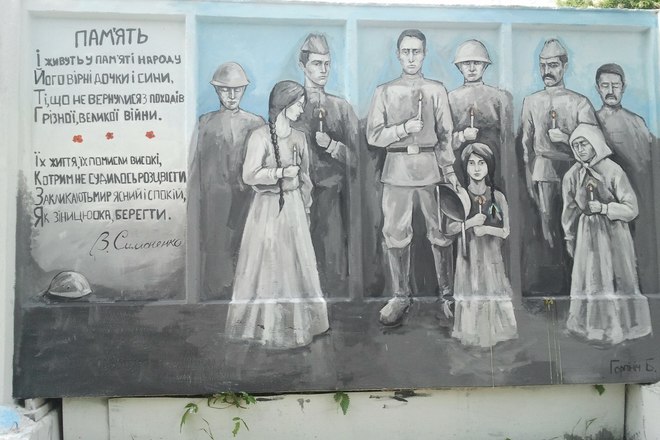 Молодий черкаський художник присвятив жертвам війни своє графіті. На стіні в середмісті – чорно-білі постаті загиблих солдатів, їхніх удів і дітей-сиріт. Поряд із людськими фігурами – слова із вірша Василя Симоненка про війну.