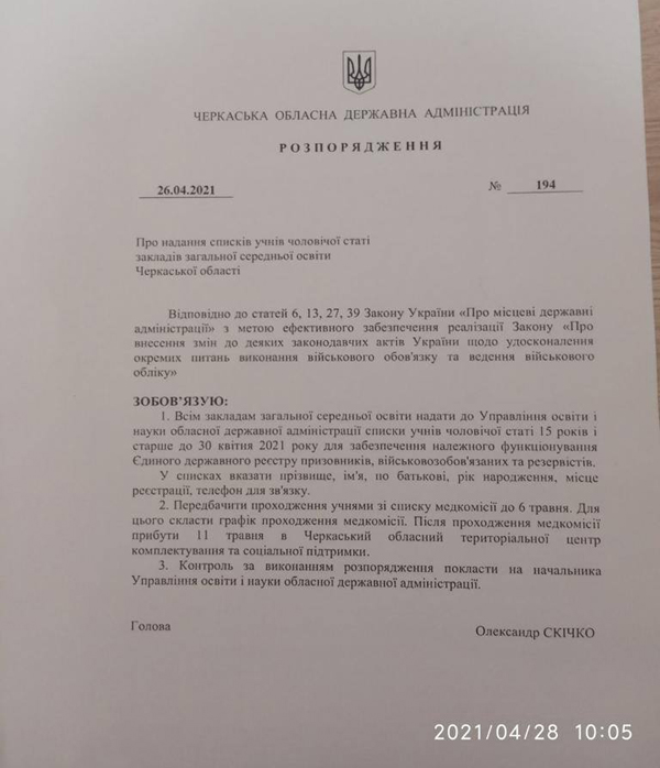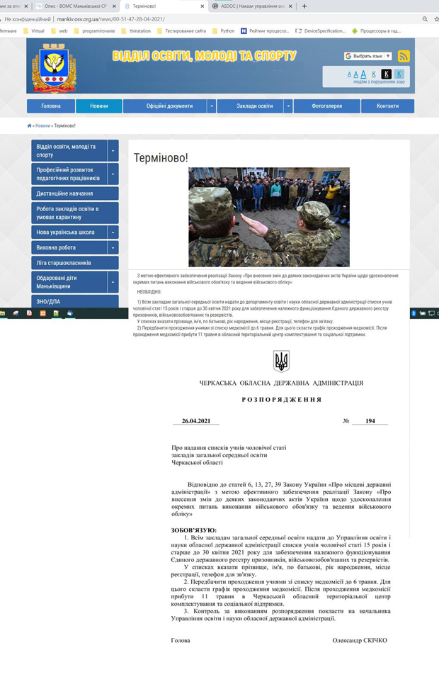 «Сьогодні вночі невідомі здійснили хакерську атаку на офіційні сайти місцевих органів управління освітою, зокрема і на сайт Управління освіти і науки Черкаської ОДА. Невідомі поширили фейкове розпорядження голови Черкаської ОДА № 194 від 26 квітня 2021 року, – каже начальник управління. – Ми розцінюємо це як посягання на органи місцевого самоврядування виконавчої влади, тому що людей змушують до вчинення неправомірних дій».