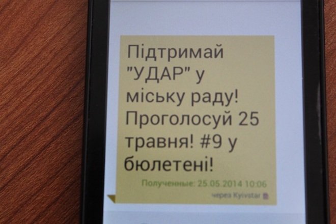 У день голосування партія "УДАР" продовжує агітувати. Виборцям надходять СМС-повідомлення з проханням підтримати "УДАР" у міську раду.