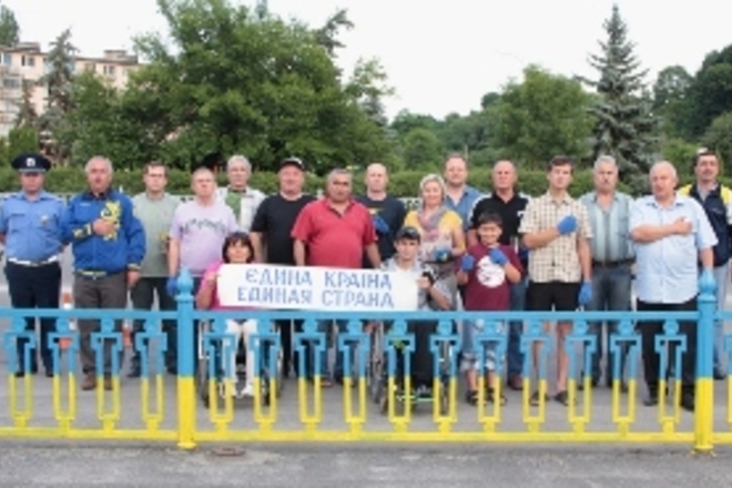 Патріотичний захід під назвою "Єдина країна – Единая страна" відбувся за ініціативи Канівської районної профспілкової організації працівників державних установ. Фарбою та іншими необхідними матеріалами активістів забезпечили підприємці Канівщини.