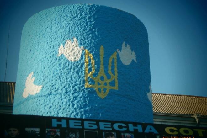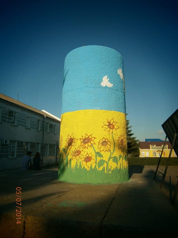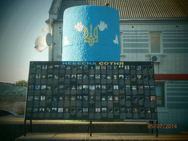 Тепер в центрі міста замість похмурого, громіздкого, сірого цоколя височіє споруда, розфарбована в кольори українського прапора, прикрашена зображенням державного ерба України, який підтримують голуби – птахи, що символізують мир і любов. Нижню частину постаменту огорнули своїми стеблами соняхи – квіти сонця, праці і достатку.