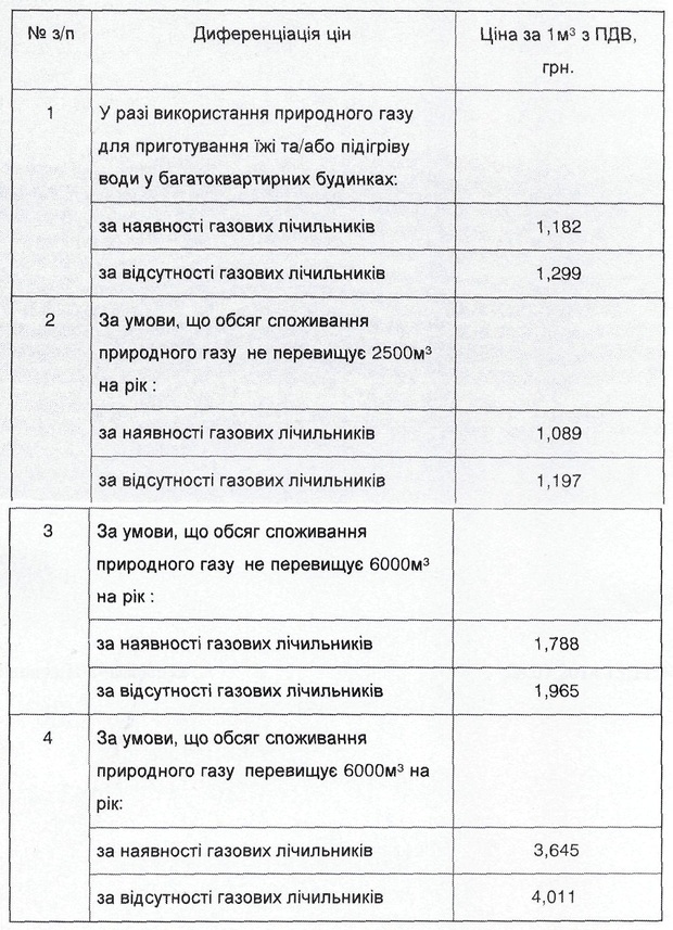 Для тих, хто споживає не більше 6000 м3 газу на рік з лічильником доведеться викласти 1,788, а без – 1,965 грн за м3. Якщо ж обсяг споживання природного газу на рік перевищує 6000 м3, то це коштуватиме 3,645 та 4,011 грн відповідно.