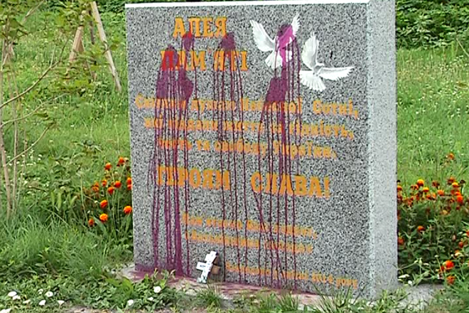 До черкаських правоохоронців звернулися небайдужі громадяни та повідомили про те, що пам’ятник Небесній Сотні, який нещодавно було встановлено в місті Черкаси поряд з Долиною троянд, невстановлені особи облили невідомою речовиною. На місце події негайно виїхала слідчо-оперативна групу Соснівського райвідділу міліції.