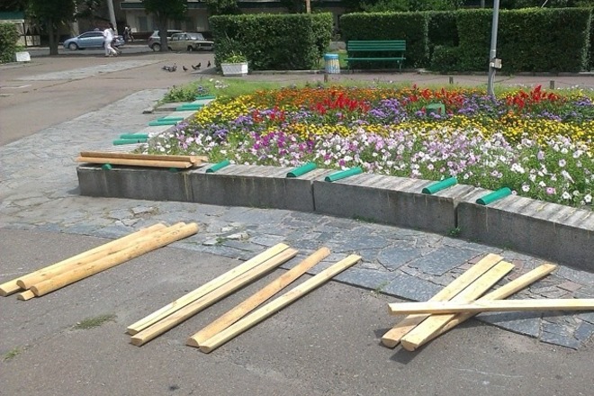Водночас, як повідомляє у Facebook черкаська журналістка Вікторія Черкасова, вчора лавки почали перефарбовувати на жовто-зелені.