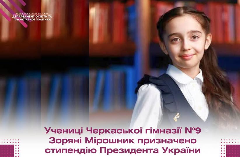 Учениці 6 класу Черкаської гімназії №9 ім. О.М. Луценка Зоряні Мірошник призначено стипендію Президента України. Про це повідомляється на сайті гімназії.