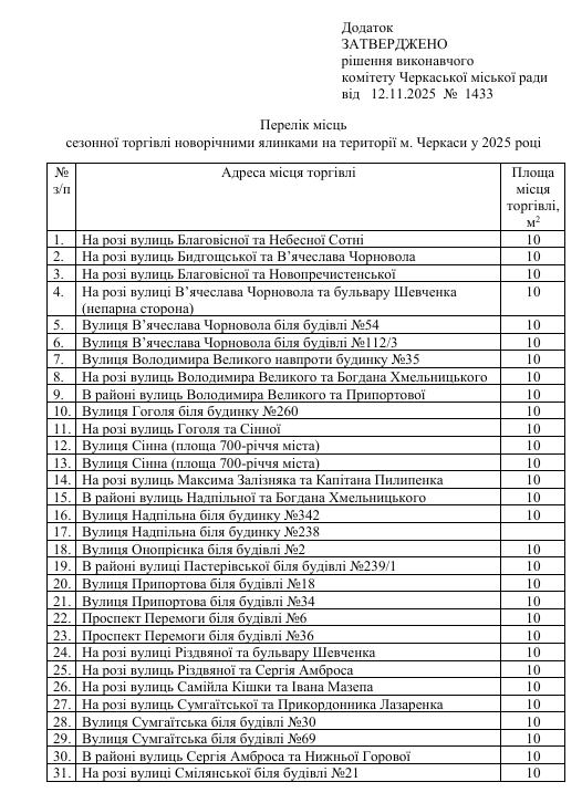 Відповідний режим торгівлі затверджений рішенням Черкаської міської ради №1433 від 12 листопада 2025 року за поданням КП «Черкаські ринки». Торгівля триватиме щодня з 7:00 до 20:00, тож вибрати зелену красуню можна буде у зручний час — як до, так і після роботи.