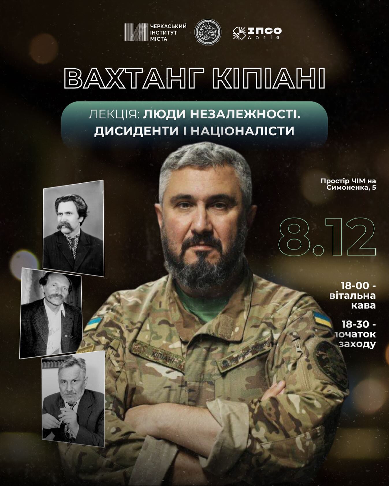 У понеділок, 8 грудня, у просторі Черкаського інституту міста відбудеться лекція Вахтанга Кіпіані «Люди Незалежності. Дисиденти й Націоналісти». Про тих, хто формував український рух опору, відстоював права людини й закладав підвалини нашої державності задовго до сьогодення.