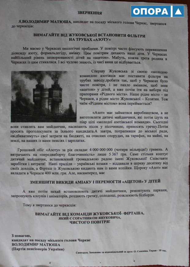 Так, у поштові скриньки виборців було рознесено звернення до черкасців від кандидата на посаду міського голови від Партії пенсіонерів України Володимира Матюші із закликом вимагати встановлення фільтрів на трубах "Азоту", щоб "не пахло аміаком, щоб зник "ацетон" у дітей". Тут також зазначено, що рідне місто почесного президента ПАТ "Азот" Валентини Жуковської не Черкаси, а Козятин, і "чиїм "Рідним містом" вона переймається?". Як відомо, Валентина Жуковська активно займається агітацією партії "Рідне місто", яке також бере участь у місцевих виборчих перегонах.