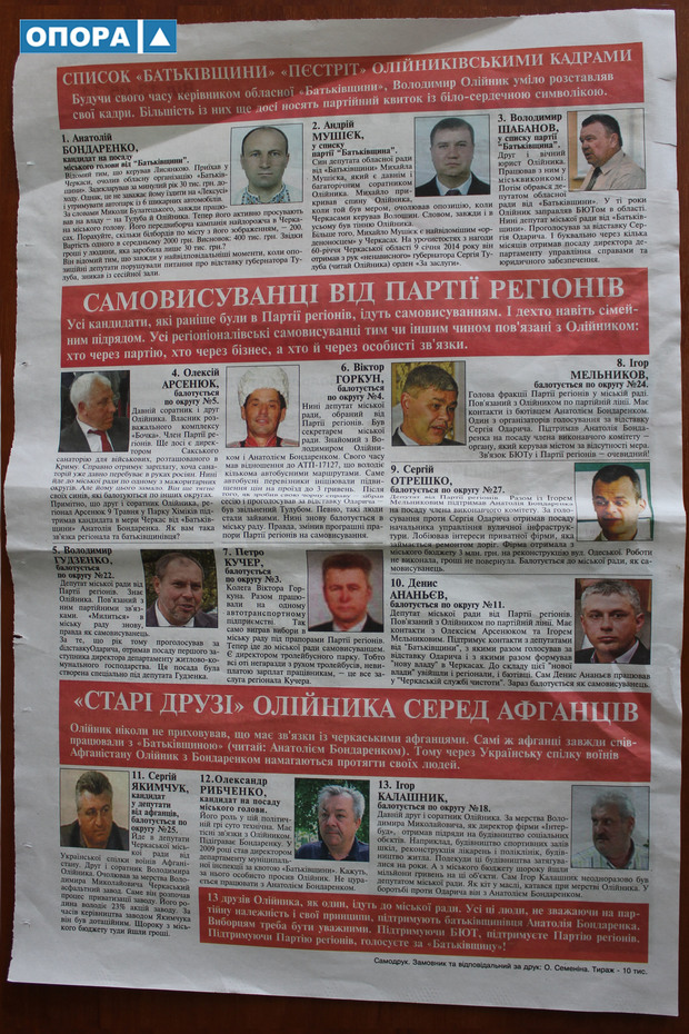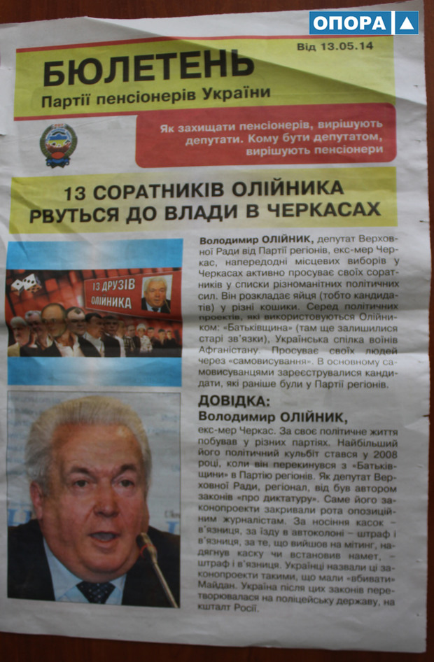 Бюлетень "Партії пенсіонерів України" від 13 травня має назву "13 соратників Олійника рвуться до влади в Черкасах". Аркуш формату А3 містить коротку довідку про самого Володимира Олійника, нині депутата Верховної Ради від Партії регіонів, а на звороті – такі ж довідки про його 13-х "соратників", які зараз балотуються в міську раду по спискам партій та багатомандатних округах від різних політичних сил. Серед них – "ВО "Батьківщина", Партія регіонів, Українська спілка ветеранів Афганістану. Усі матеріали направлені на агітацію проти депутатів у міську раду від зазначених вище суб’єктів і двох кандидатів у мери Анатолія Бондаренка (ВО "Батьківщина") і Олександра Рибченка (Партія ветеранів Афганістану).