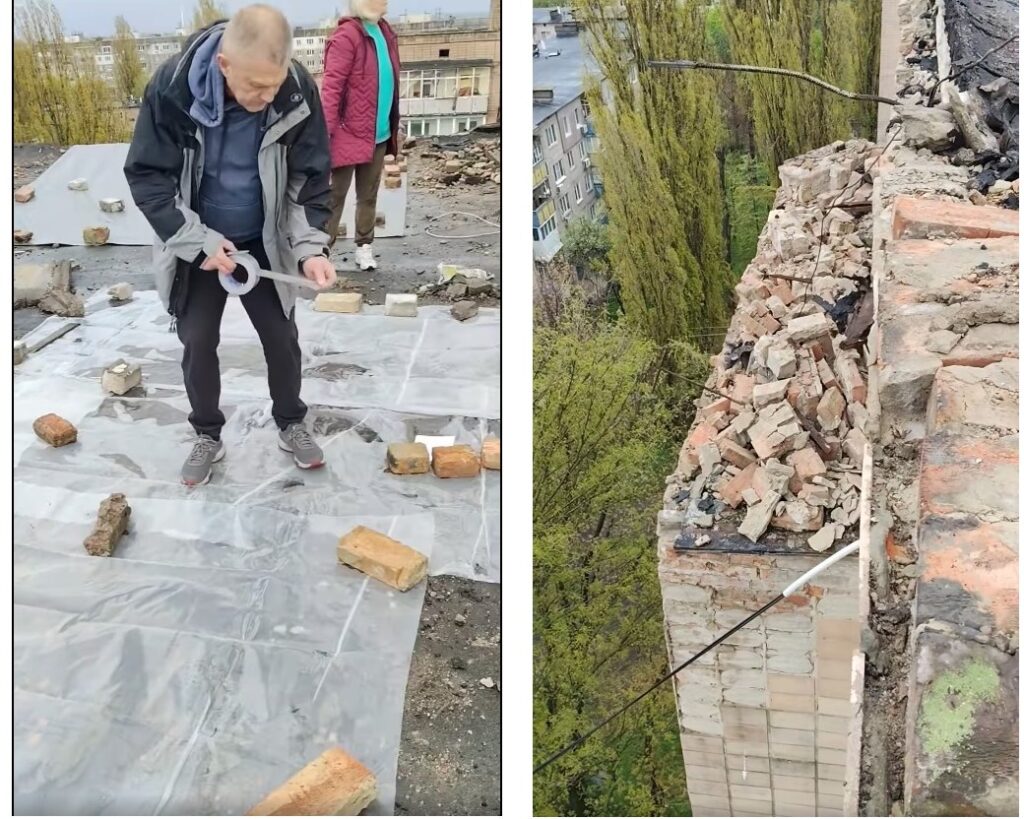 Жителі багатоповерхівки у Черкасах, куди майже два тижні тому влучив російський шахед, самотужки лагодять покрівлю. Через зливу вода почала потрапляти в квартири, тому мешканці накривають покрівлю плівкою. Відео на своїй сторінці виклала Ірина Юрченко.