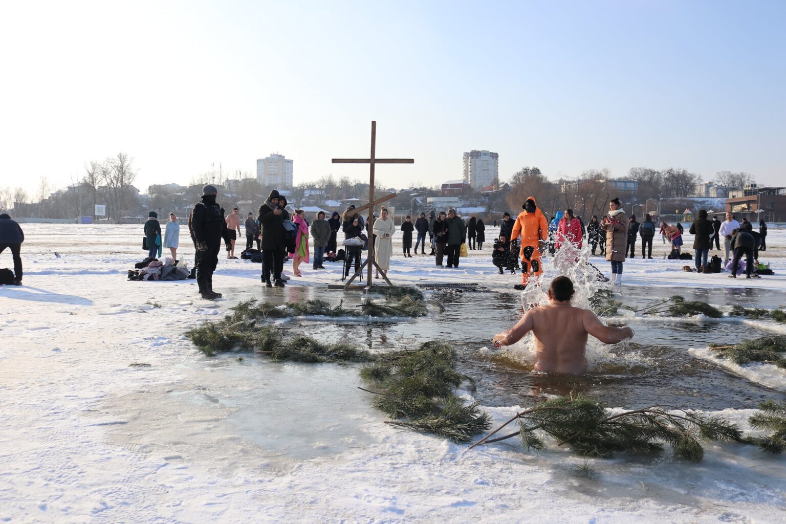 Не менш відомою традицією є занурення в ополонку у формі хреста — це символічне наслідування купелі Ісуса у Йордані. Віряни, які практикують це, занурюються тричі, промовляючи молитву «В ім’я Отця, і Сина, і Святого Духа», вірячи, що таким чином вода очищує тіло й зміцнює дух.