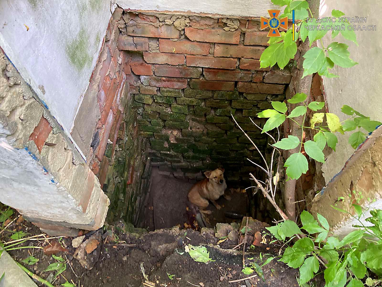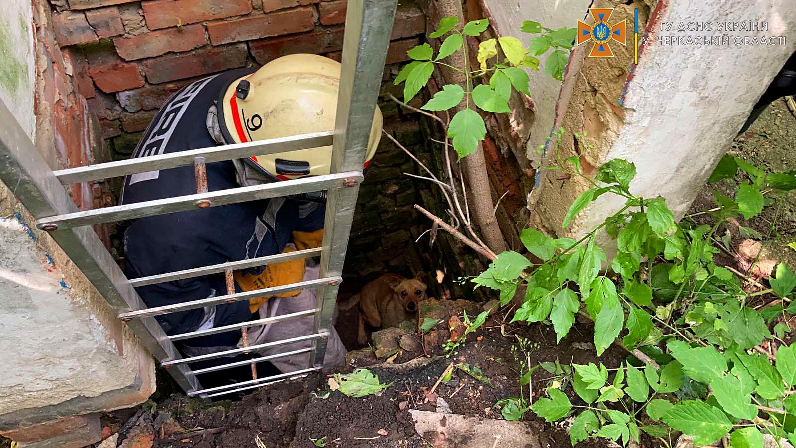 На місце події прибули співробітники ДСНС, які за допомогою драбини спустилися до двометрової ями та підняли чотирилапого на поверхню.