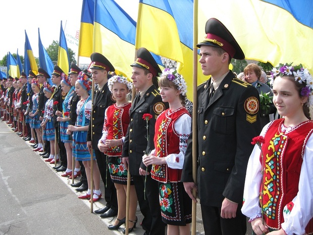 Ветерани сидять біля сцени на стільцях. Навпроти сцени стоять хлопці у формі та одягнені в українські костюми дівчата.